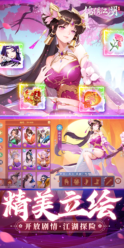 锦绣江湖是一款融合了卡牌、放置和RPG玩法精髓放置武侠手游,以奇情怪趣的“人形兵器与江湖百派纷争”为世界观,携数百位风情万千的高颜值侠客,开放式的江湖大世界探索玩法,带给你闲趣写意的全新江湖体验。上百个经典武林门派,通过丰富的背景故事将其串联起来。在这里,每个门派侠客技能设计都带有典型的武侠元素和门派特色,如狂浪不羁的海沙帮、劲飒十足的五毒教、侠气倾天的华山派、讲义气的峨眉派...玩家可根据自己的需要,搭配武侠阵容。
